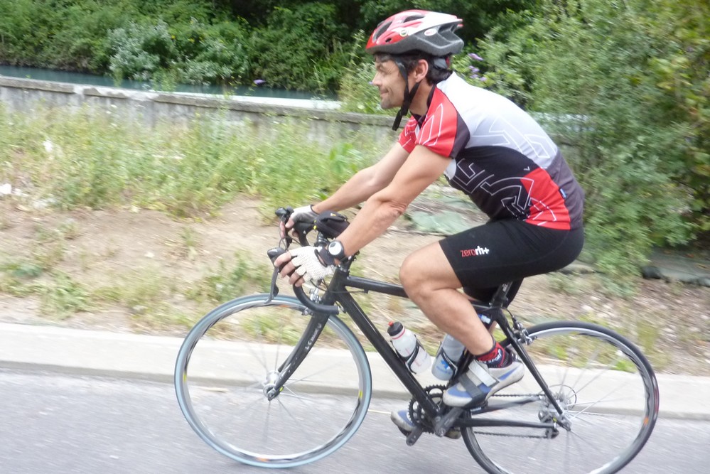 Flo qui a tout quitté : les sacoches, le casque (pas bien ...) mais garde le maillot de la recherche pour le cancer du sein.